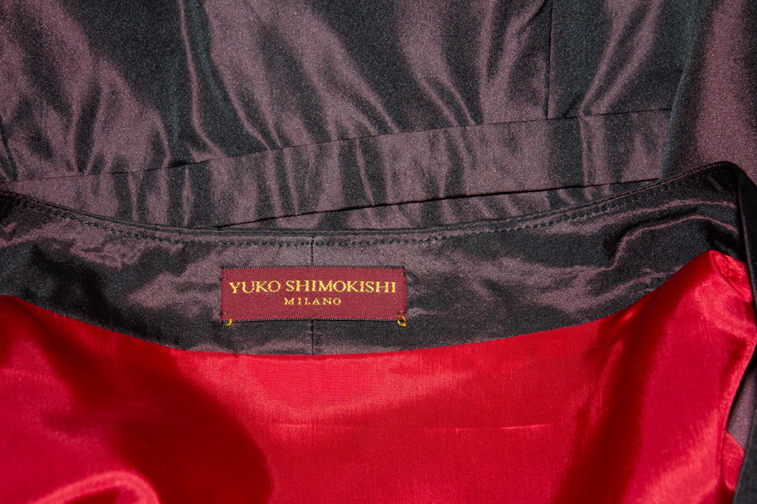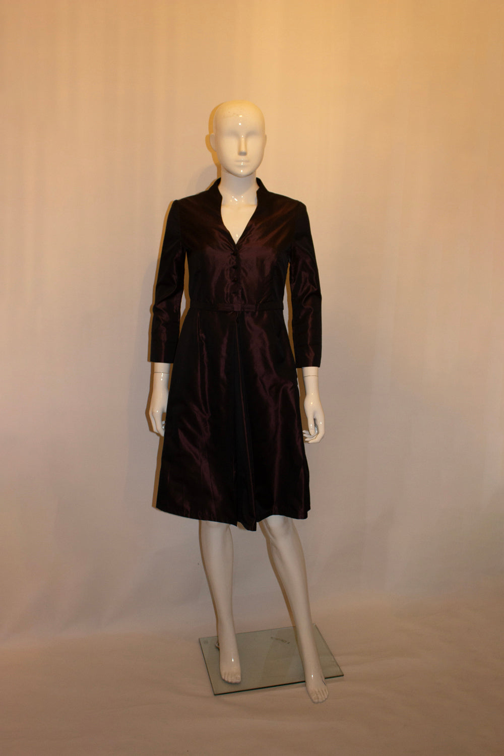 A wonderful dinner/cocktail dress by Yuko Shimokishi of Milan. The dress is in an attractive aubergine colour with red lining and has a v neckline and side zip opening. It has elbow length sleaves and a pleat at the front.