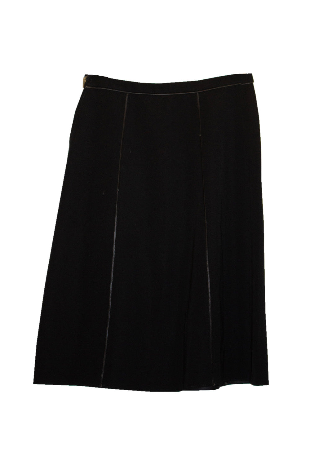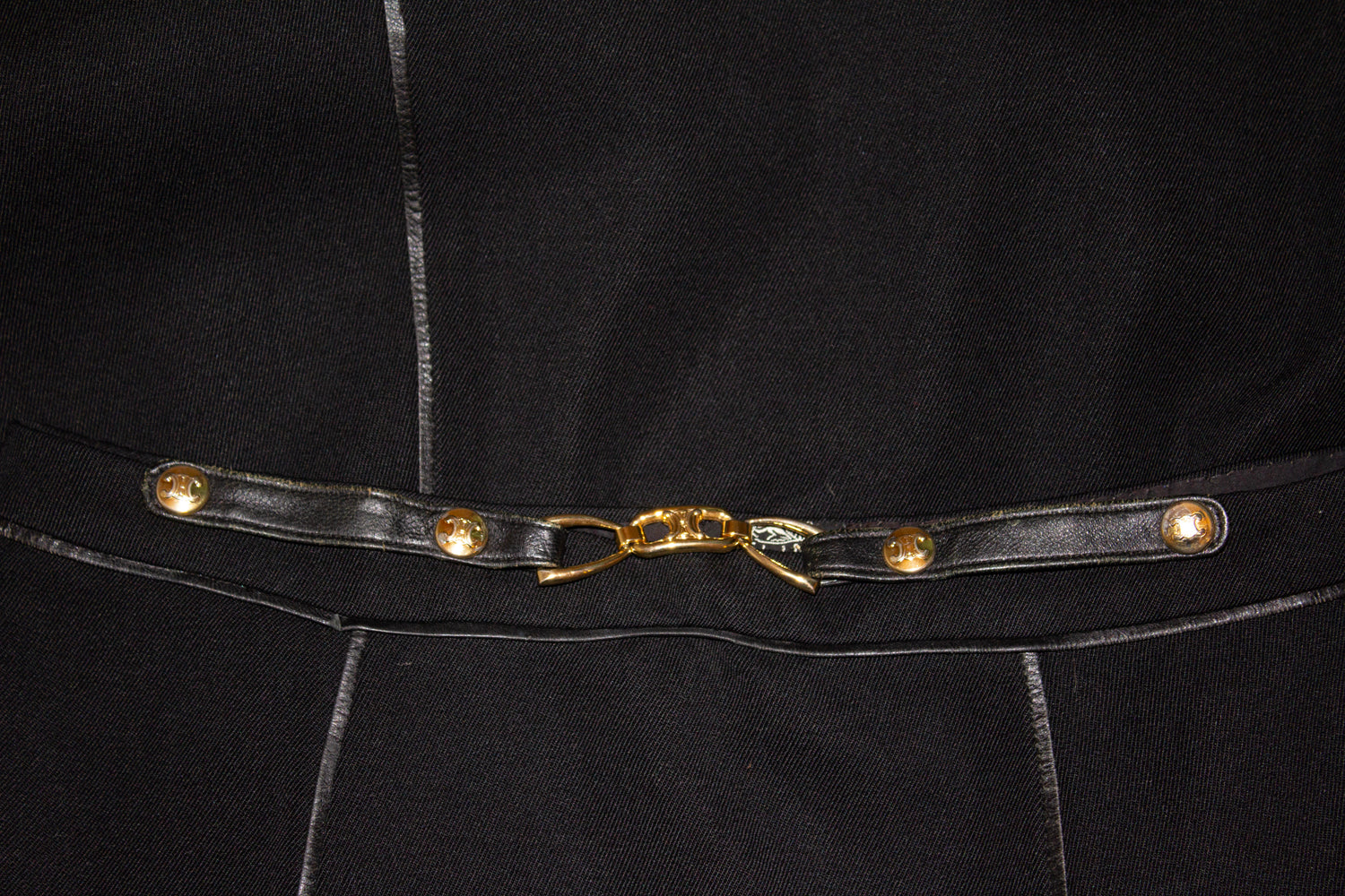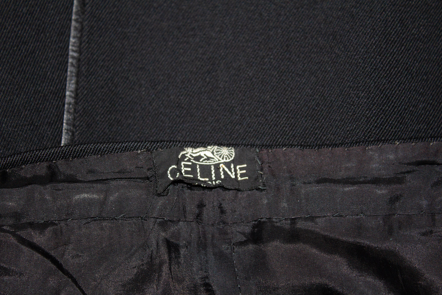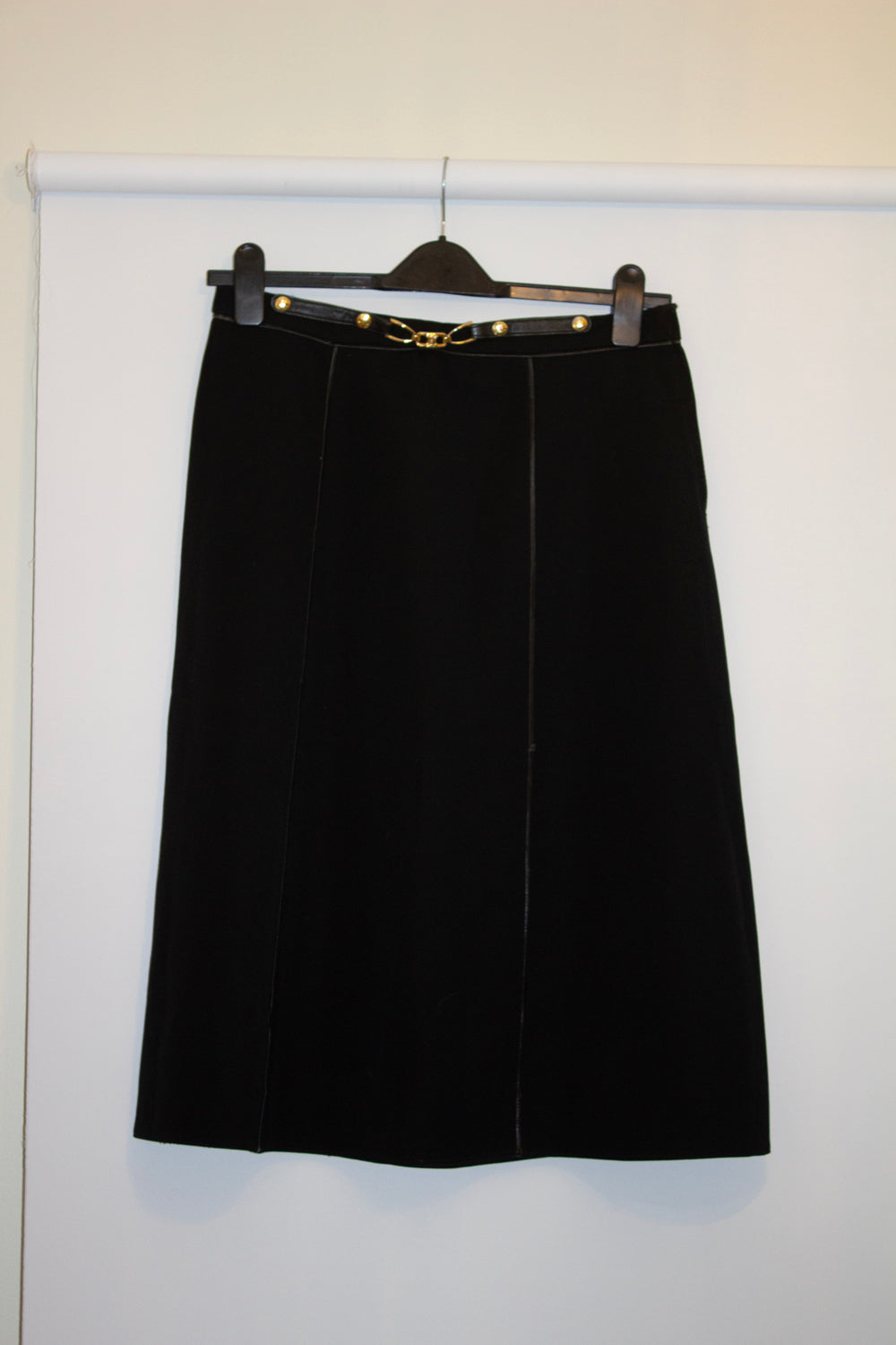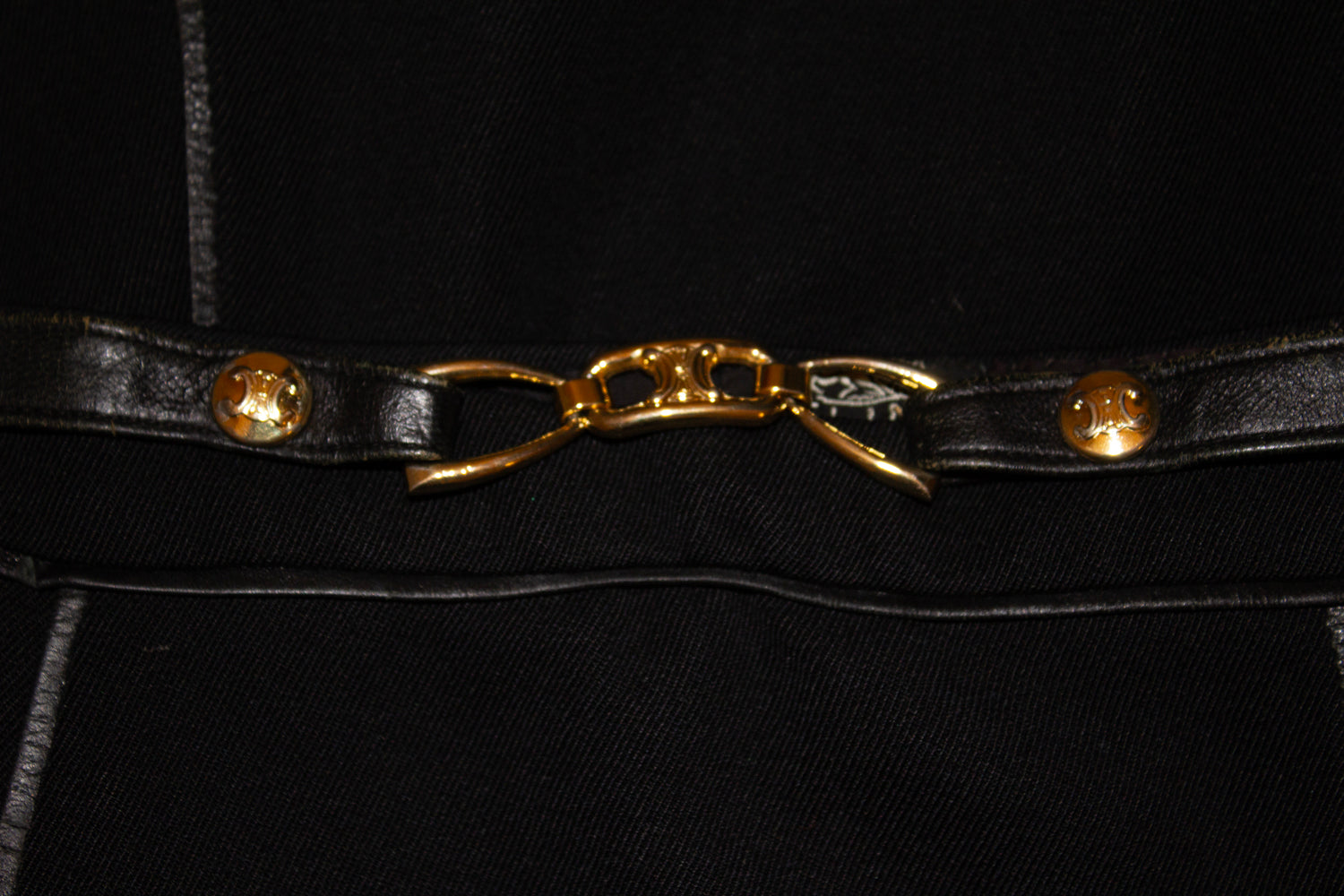 A chic vintage skirt by Celine . In a navy wool, the skirt is A line in shape with the snaffle detail on the front. It is fully lined with a side zip opening, and has leather panel details.