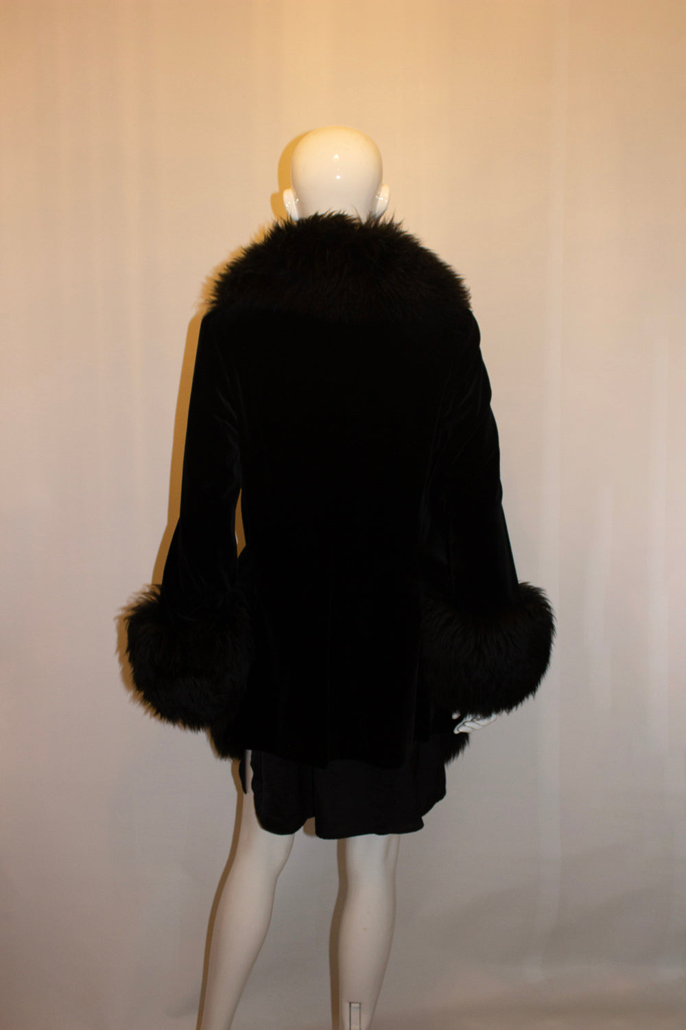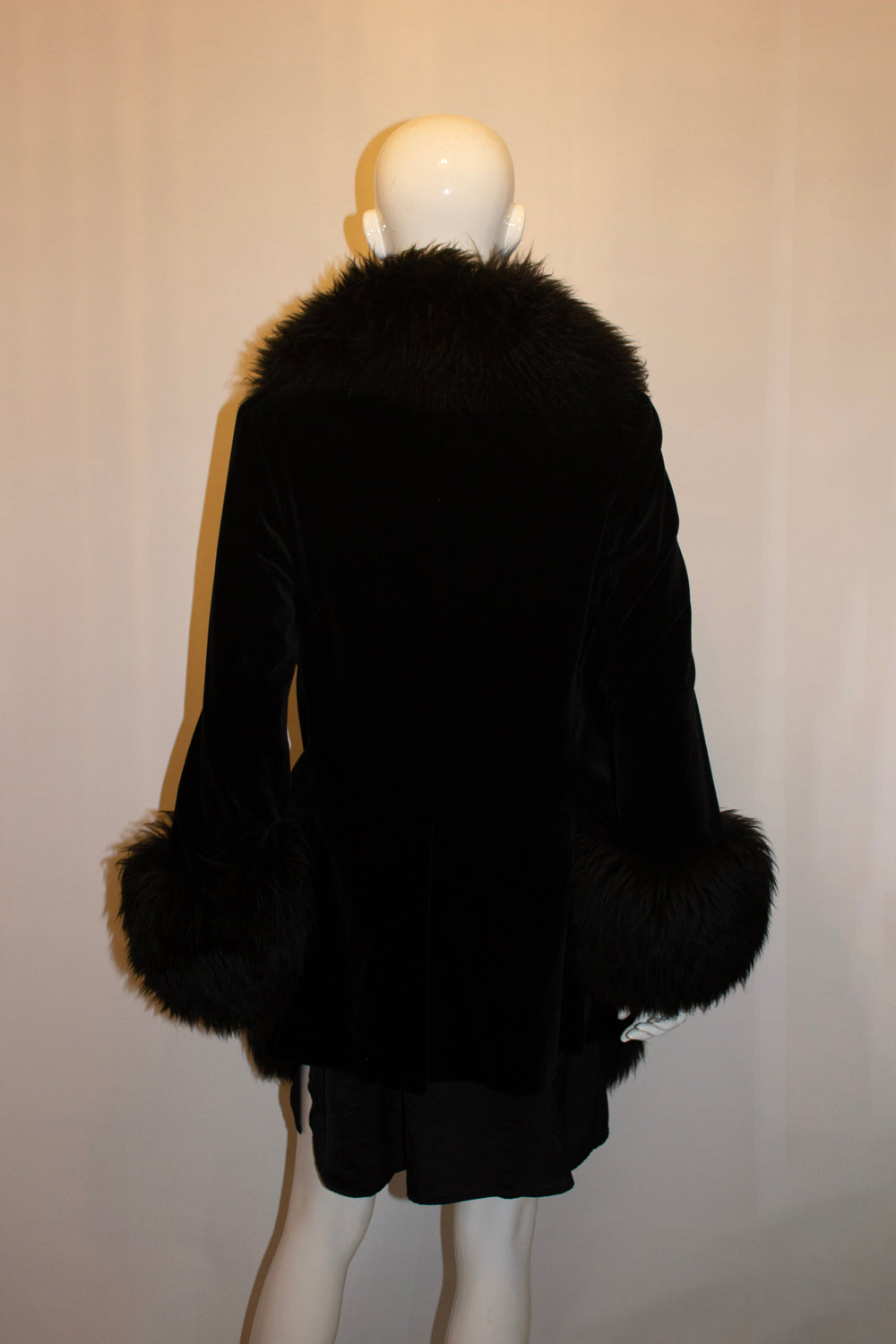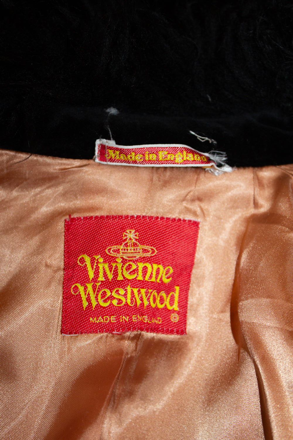 A stunning and rare vintage jacket by Vivienne Westwood., from the Dressing Up Collection. In black velvet with faux fur trim, the jacket has great tailoring and is a wonderful statement piece. The jacket has a vent at the back and two pockets at the front. Made in England.