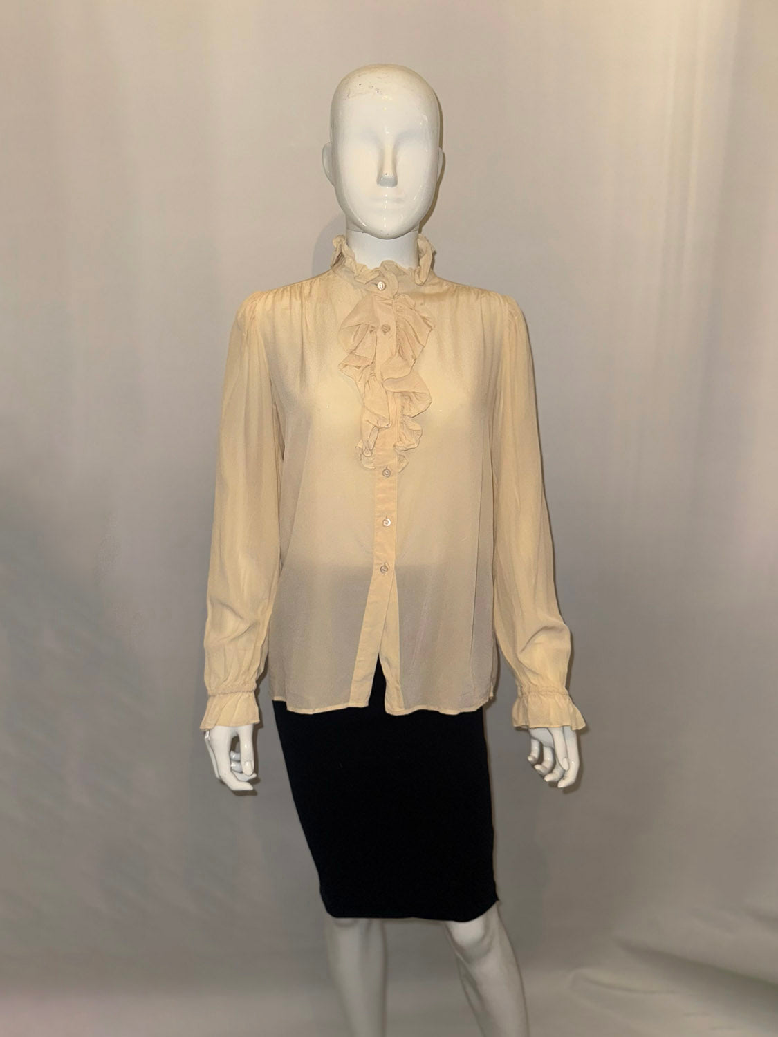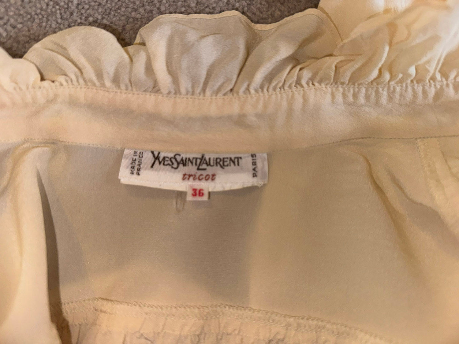 A pretty vintage silk blouse by Yves Saint Laurent, tricot line. The blouse is in a lovely silk , and has elasticated wrists with frill detail, a ruffle collar and frill detail on the front. It has a button front opening and a back yoke with gathering.